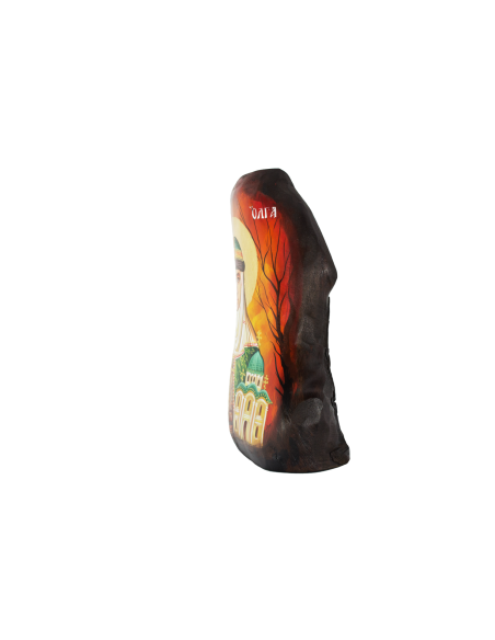 Βυζαντινή χειροποίητη αγιογραφία σε φυσικό κούτσουρο πλατάνου, φιλοτεχνημένη με τη μέθοδο της αυγοτέμπερας.