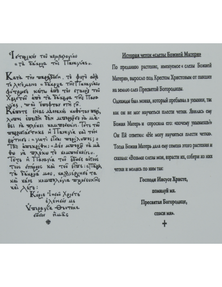Τότε η Παναγία του έδωσε αυτούς τους σπόρους και του είπε: «Πάρε τα δάκρυά μου, καλλιέργησέ τα και κάνε κομπολόγια προσευχής και λέγε: Κύριε Ιησού Χριστέ ελέησόν με. Υπεραγία Θεοτόκε σώσον ημάς.
