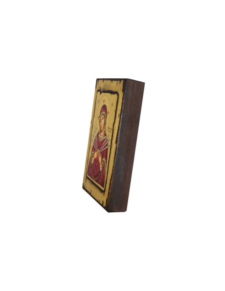 Η εικόνα της Παναγίας με τα Επτά Σπαθιά, τέσσερα στα αριστερά και τρία στα δεξιά, έχει σχέση με την προφητεία του Αγίου Συμεών του Θεοδόχου, την οποία καταγράφει ο ευαγγελιστής Λουκάς: «…καί σού δέ αυτής τήν ψυχήν διελεύσεται ρομφαία…»(Λουκ. 2.35). Τα συγκεκριμένα λόγια, αναφέρονται στον πόνο που θα βίωνε η Παναγία κατά τη στιγμή του χωρισμού από τον αγαπημένο της Υιό, όταν μπροστά στα μάτια της Τον εσταύρωσαν.