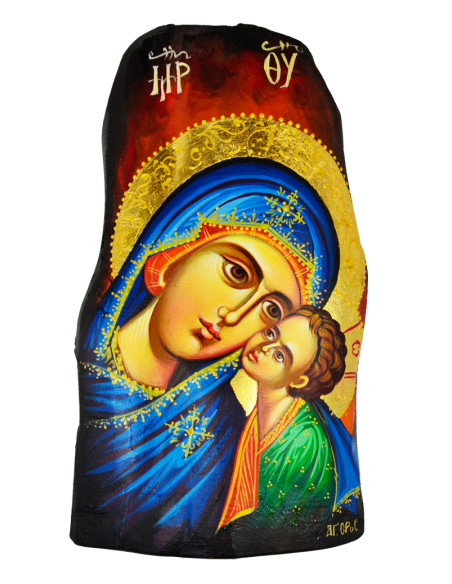 Byzantine handmade iconography on a natural sycamore log, crafted using the egg tempera method.